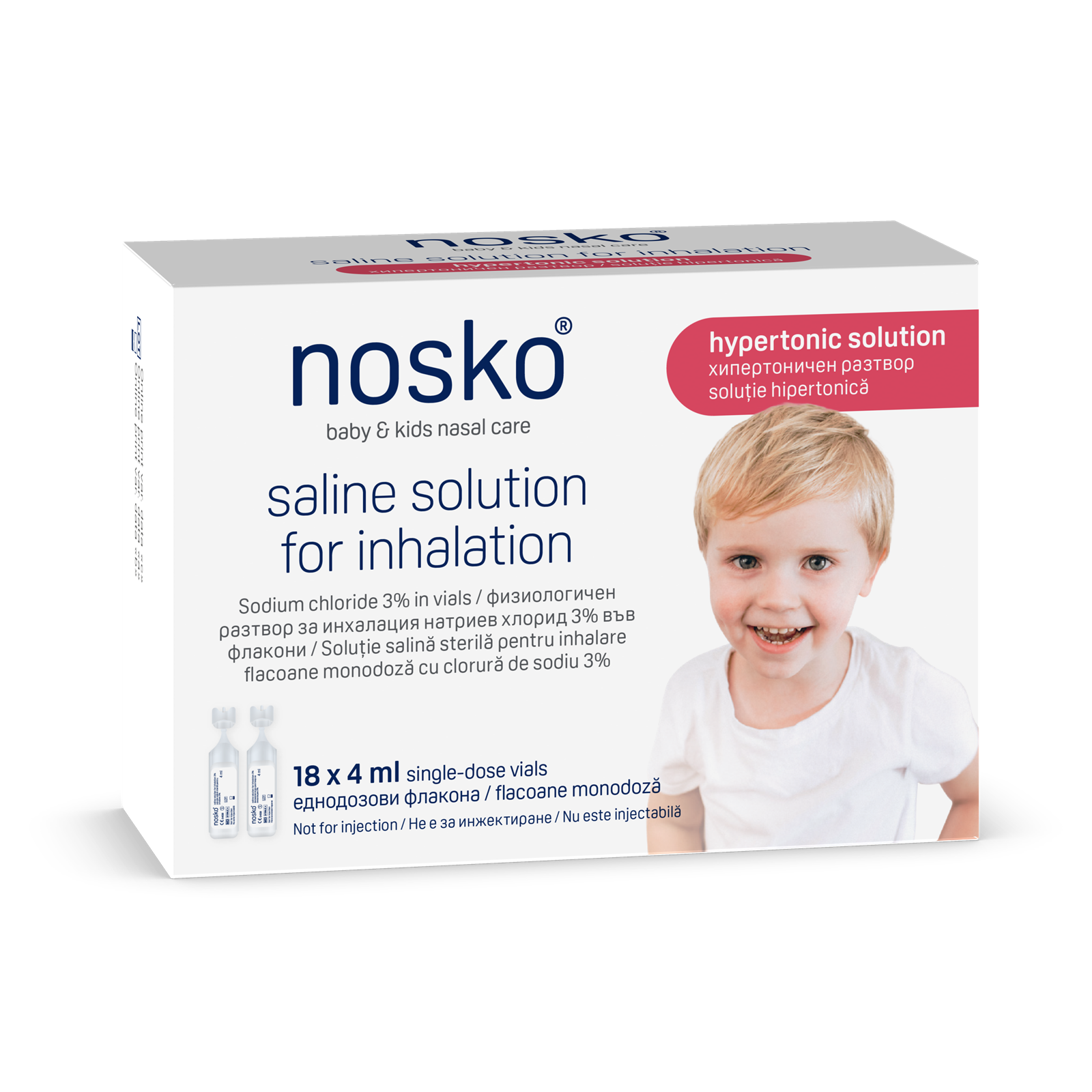 Nosko® hipertonična otopina sadrži 3 % natrijevog klorida i namijenjena je inhalaciji.